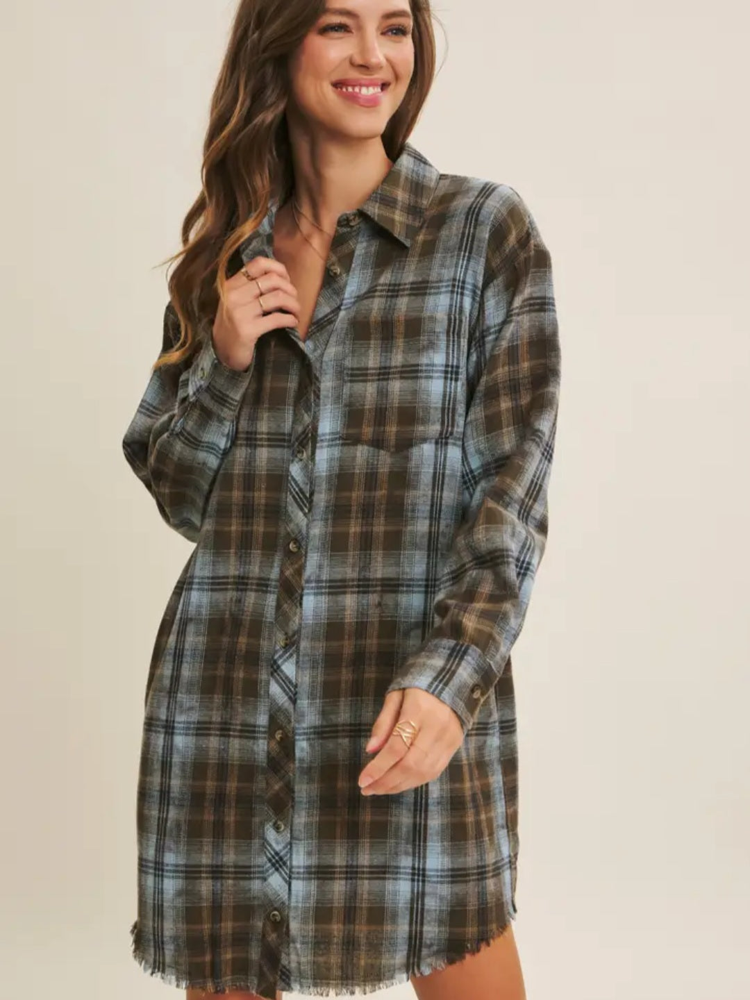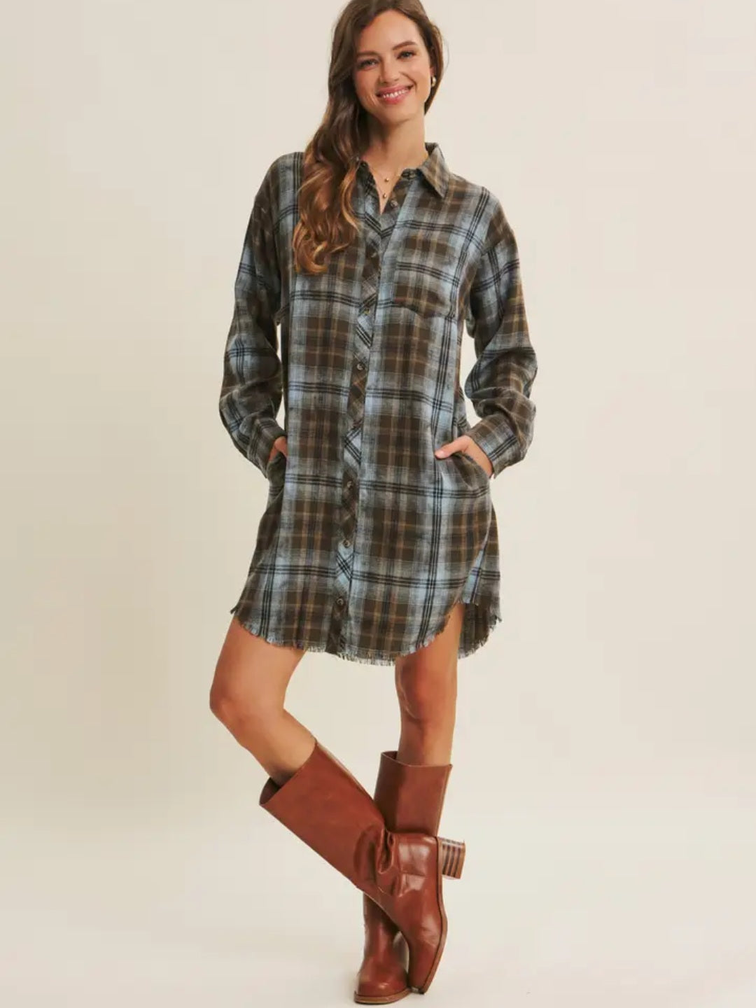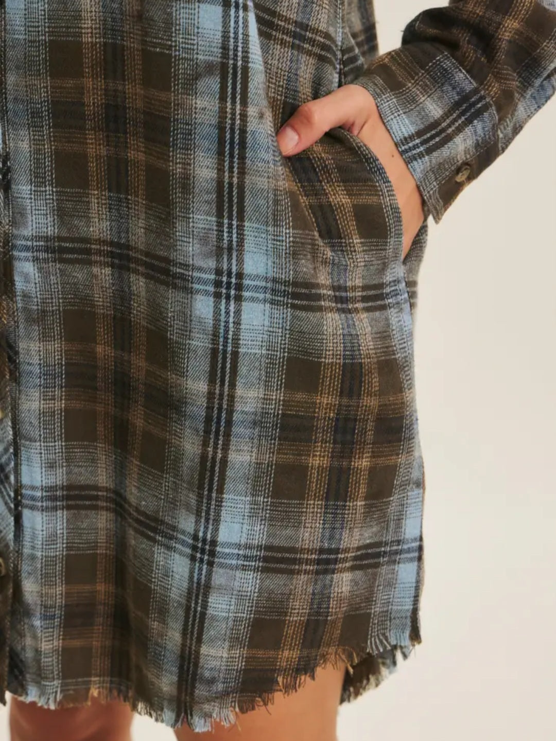 This mineral-washed plaid shirt dress takes the classic flannel vibe and elevates it with a bold, lived-in finish. Because of the unique wash, no two pieces are exactly alike—each one has that coveted one-of-a-kind, vintage-worn feel your closet will love.