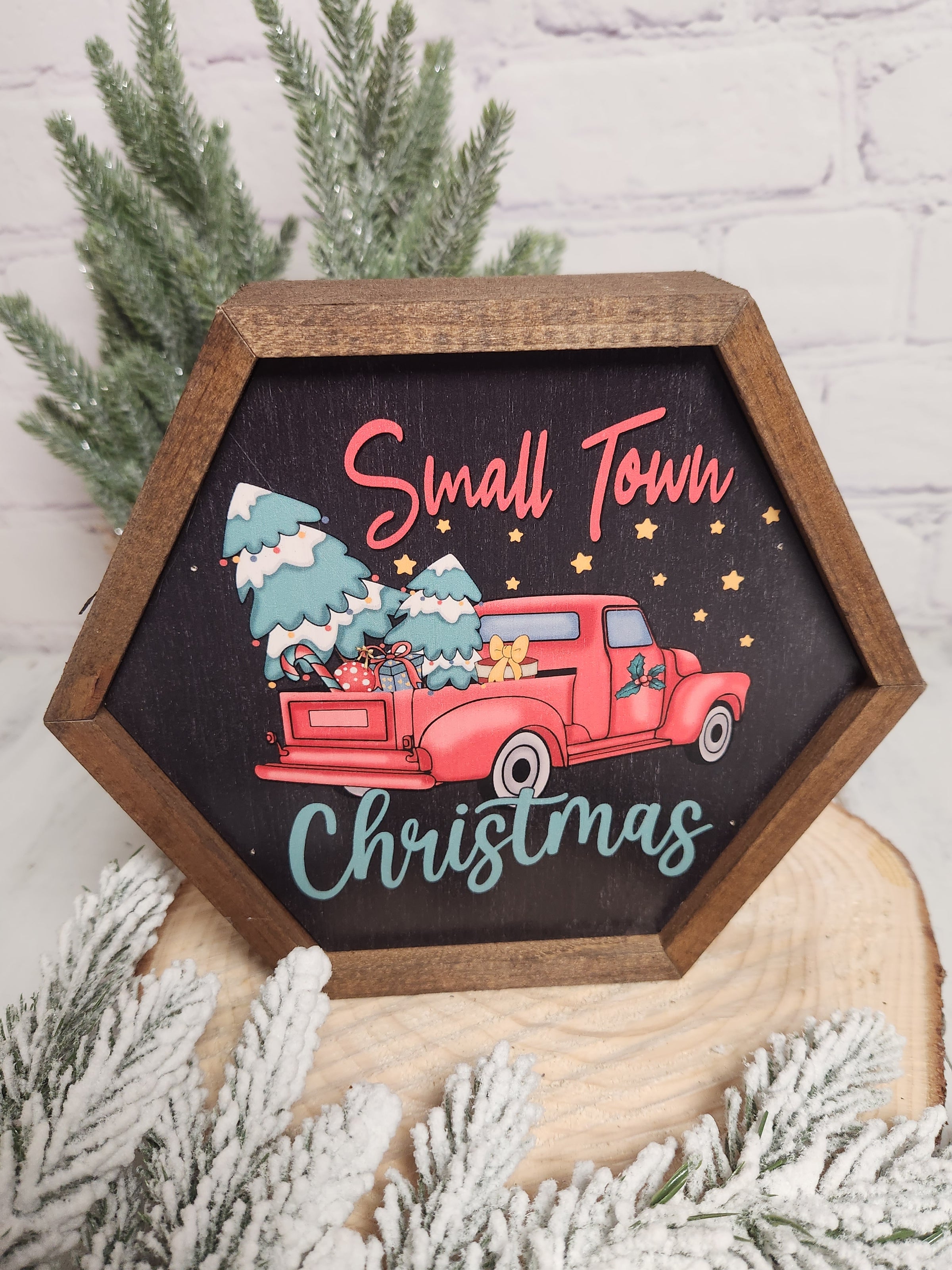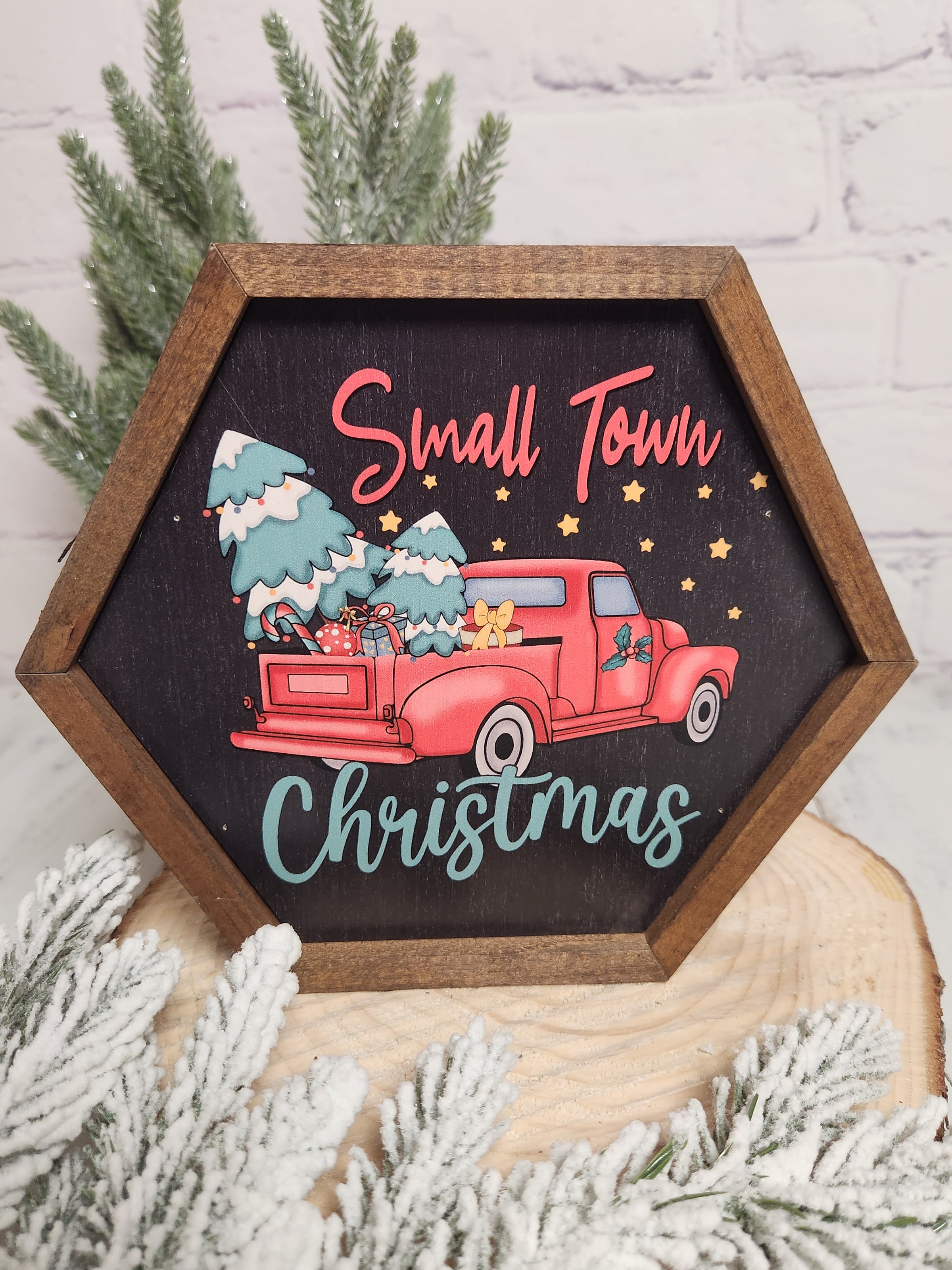 Small Town Christmas Truck Hexagon Wood Sign