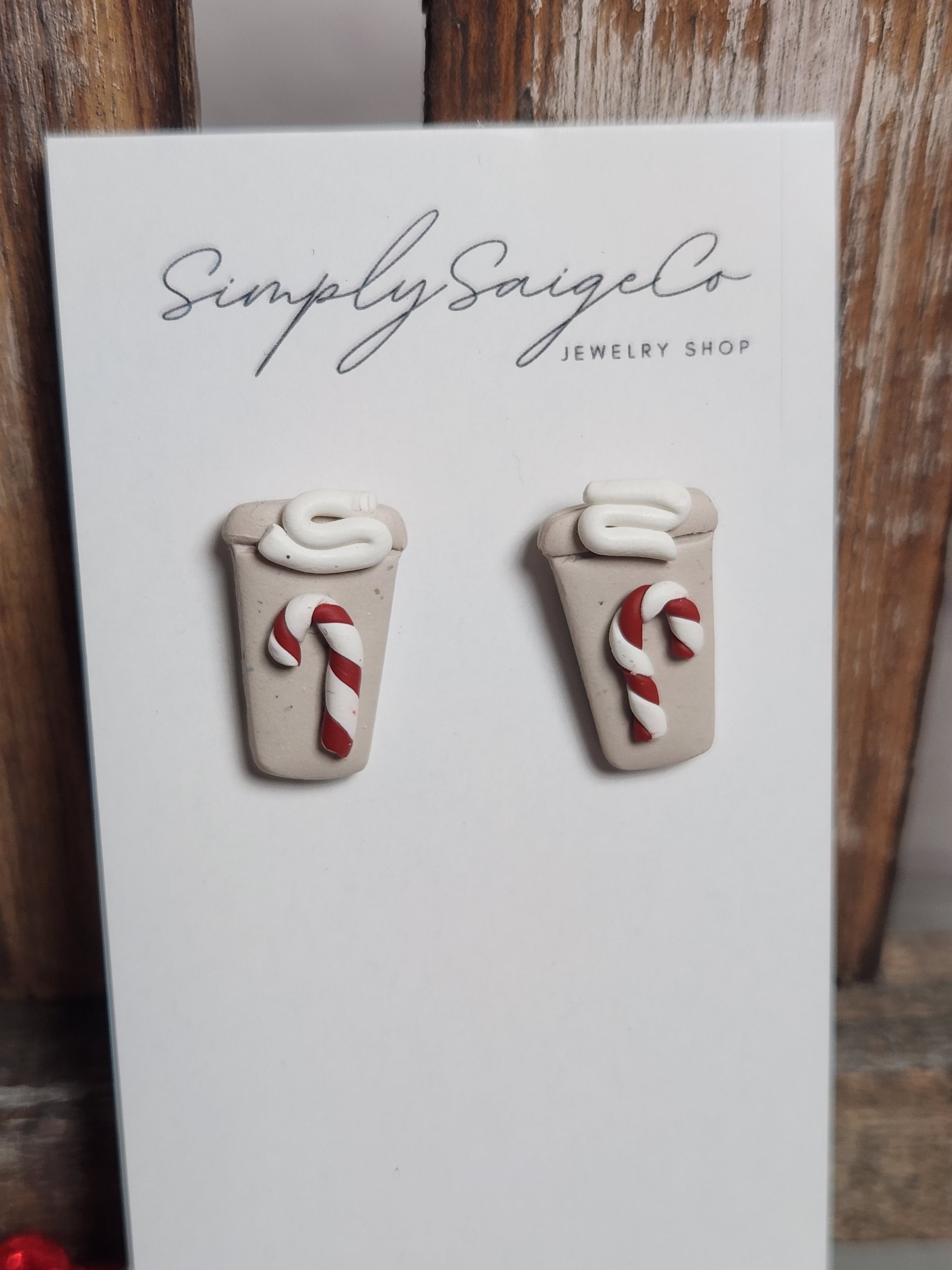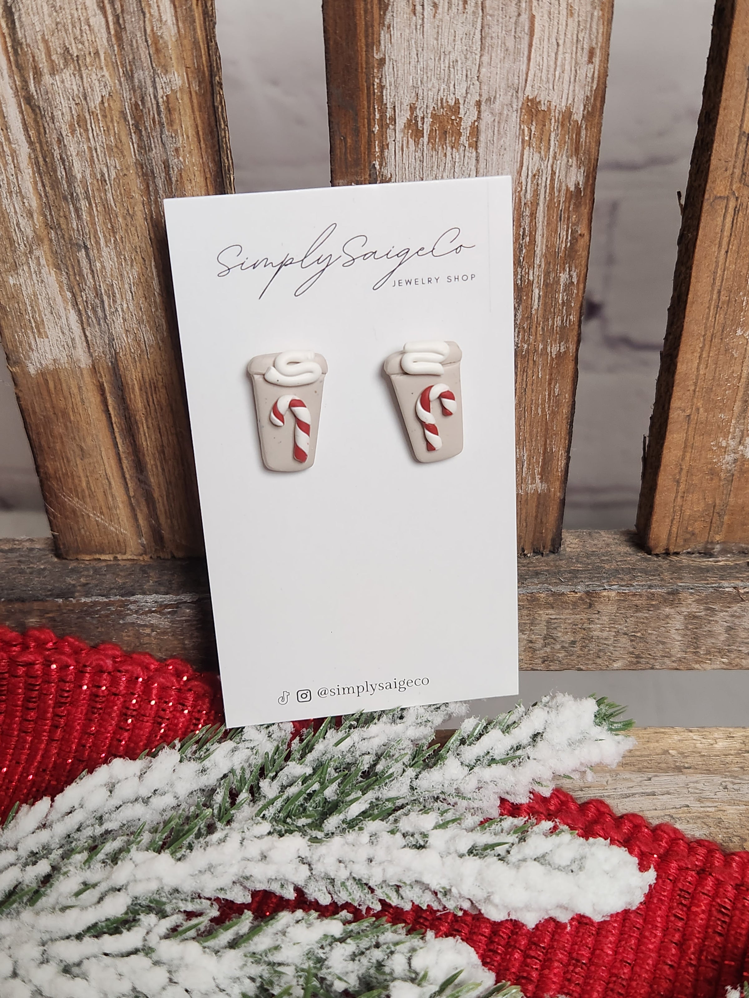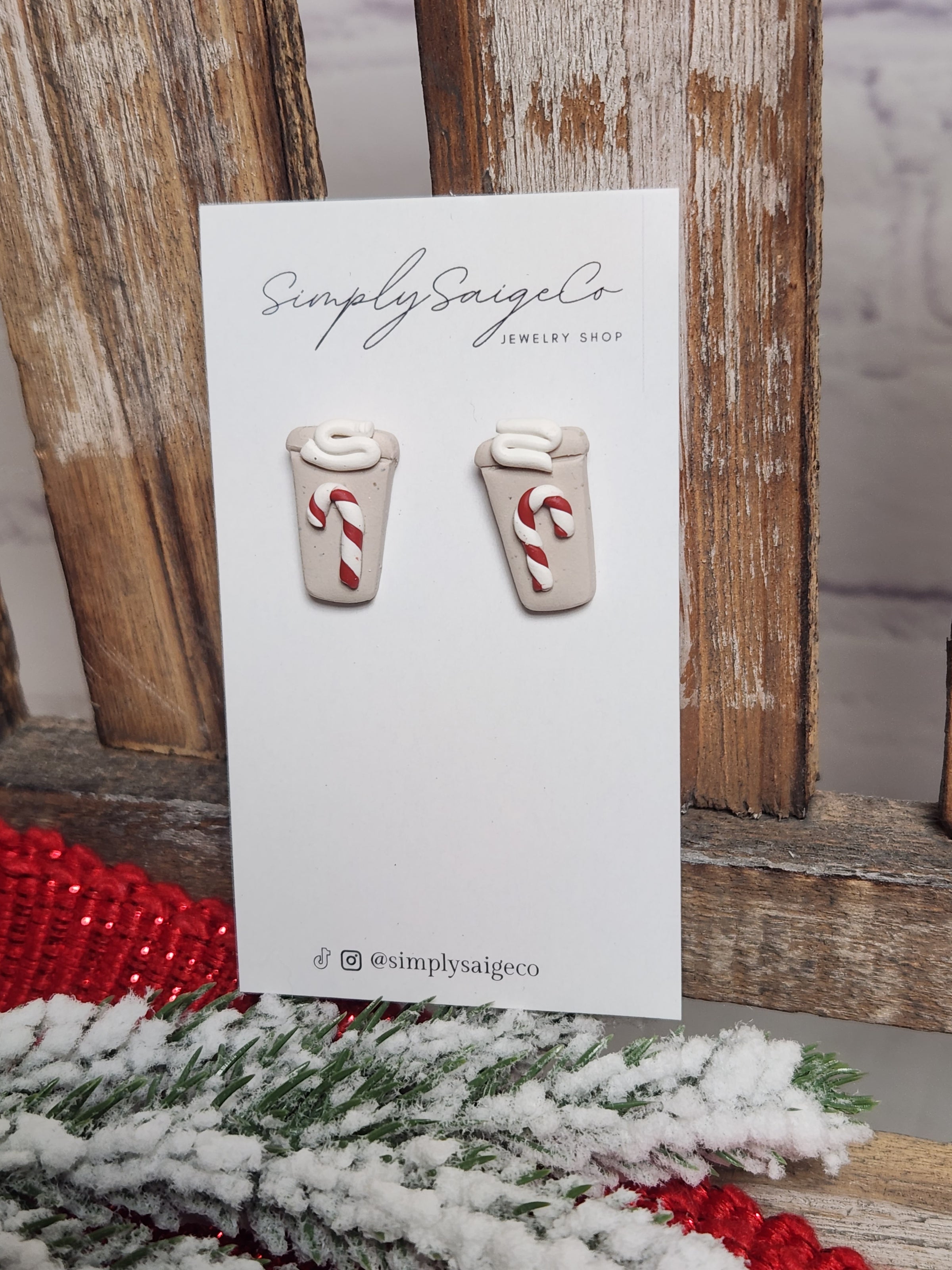 Sweet, cozy, and oh-so-festive. These handcrafted clay earrings are shaped like little peppermint lattes, complete with whipped-cream swirls and a candy-cane detail that gives them the perfect Christmas touch. Lightweight and comfortable for all-day wear, each pair is individually sculpted, making every set one-of-a-kind.