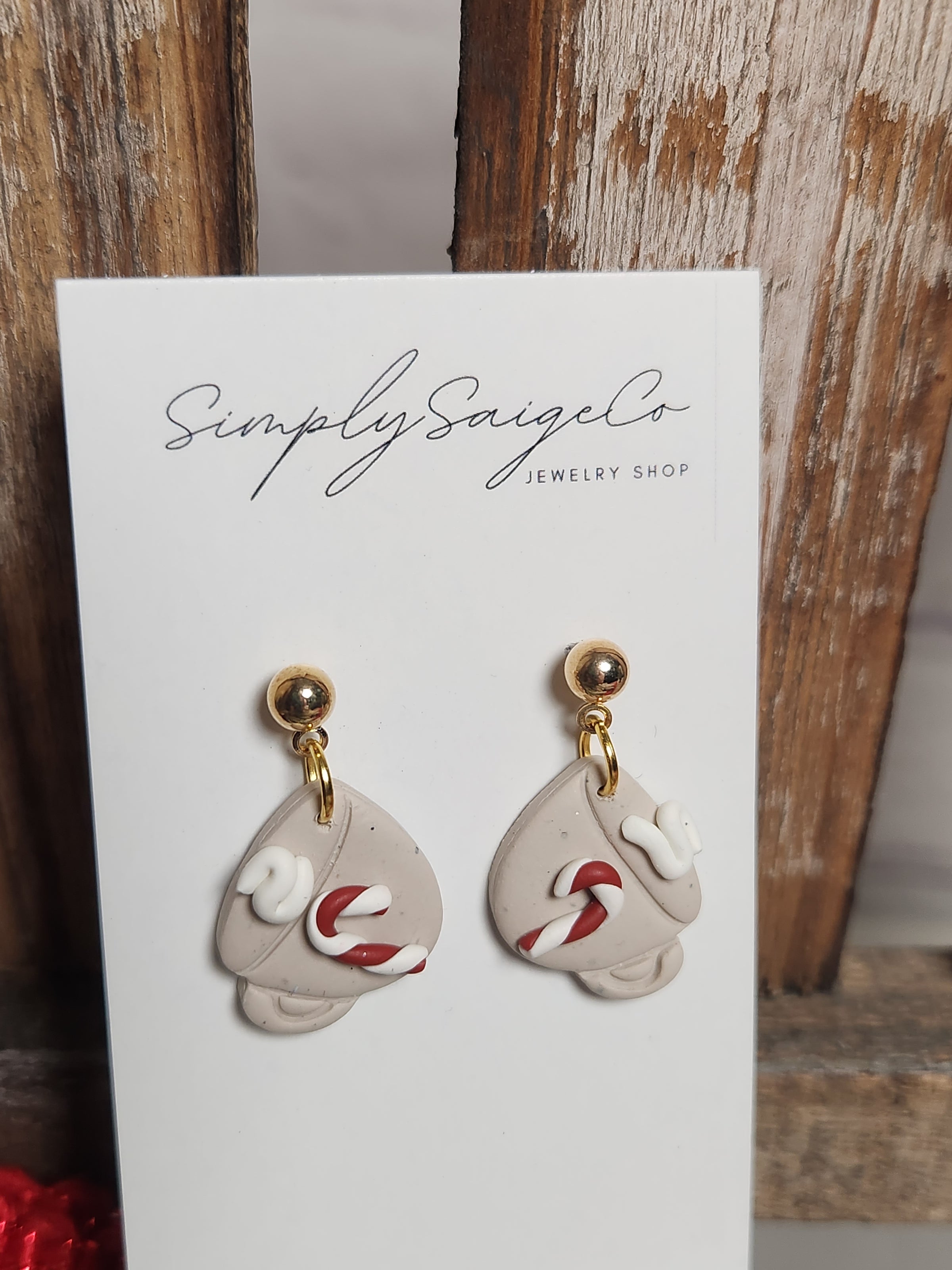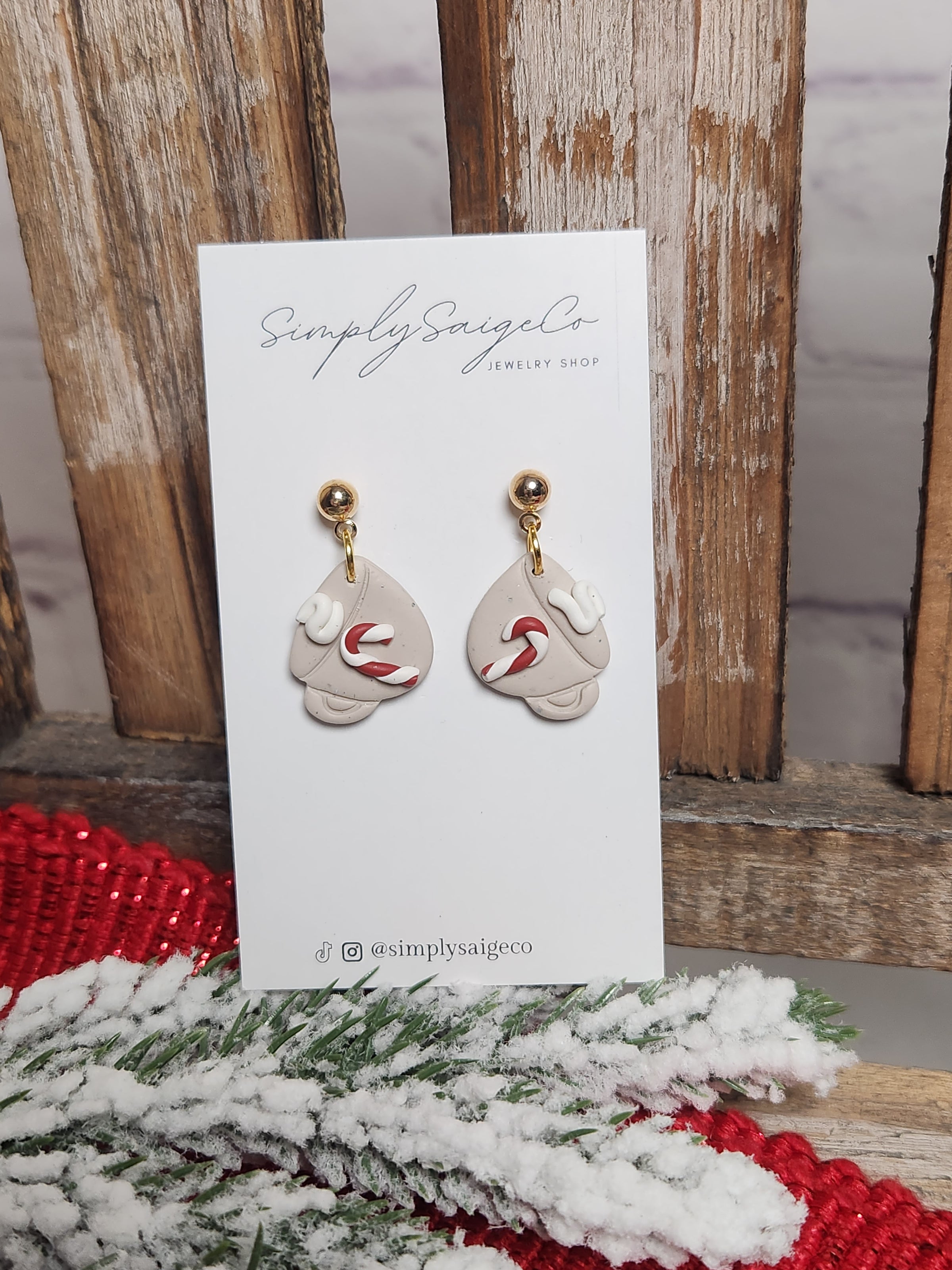 Sweet, whimsical, and perfectly festive. These handmade polymer clay earrings feature adorable holiday mugs topped with whipped cream and a tiny peppermint candy cane swirl. Each pair is crafted by hand, giving you a truly one-of-a-kind accessory with charming detail. Lightweight with gold-tone studs, they’re comfortable enough for all-day wear and cute enough to make every outfit feel a little more merry.