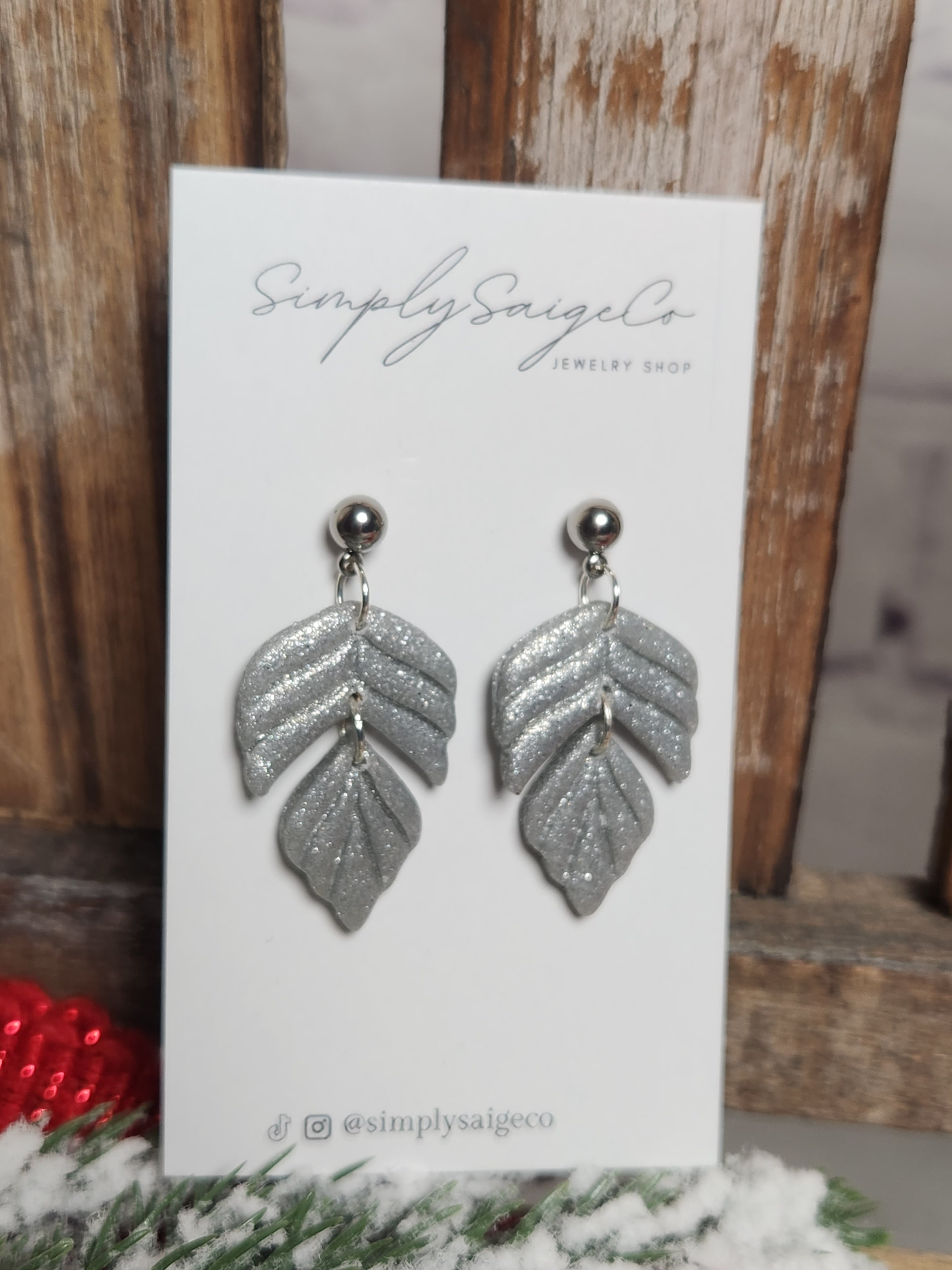 Shimmering, lightweight, and beautifully unique — these handmade clay earrings bring a touch of elegance to any look. Crafted from high-quality polymer clay, each leaf is shaped, textured, and finished by hand, making every pair one-of-a-kind. The layered leaf design adds soft movement and dimension, while the silver glitter finish catches the light just right for a subtle, festive sparkle.