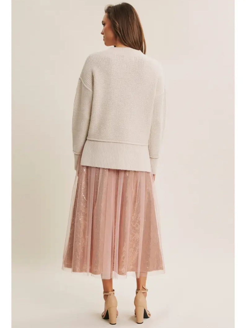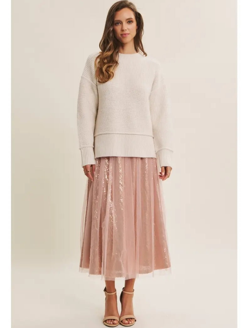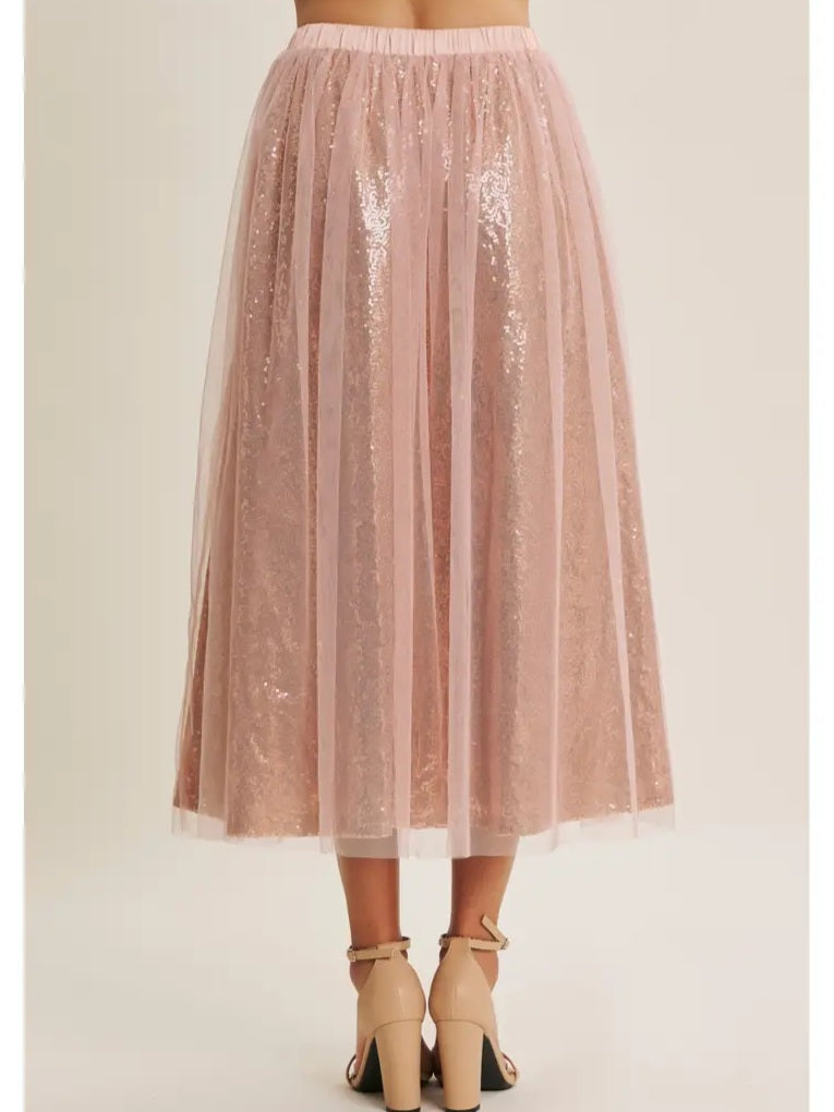This rose-gold midi skirt blends sparkling sequins with a soft mesh tulle overlay for the ultimate feminine moment.